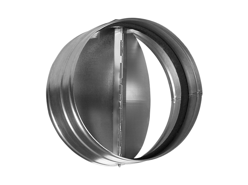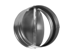 Обратный клапан с подпружиненными лопастями предназначен для автоматического перекрывания круглых воздуховодов при отключении систем вентиляции. Корпус клапана выполнен из оцинкованной стали, лопасти из листового алюминия. Крепление клапана к другим элементам системы вентиляции производится при помощи ниппельного соединения. Клапан может быть установлен в вертикальном положении.