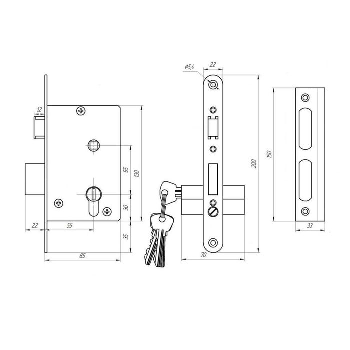 Замок врезной Гардиан 3001, б/о, без/накл, б/ручки, 4 длинных ключа